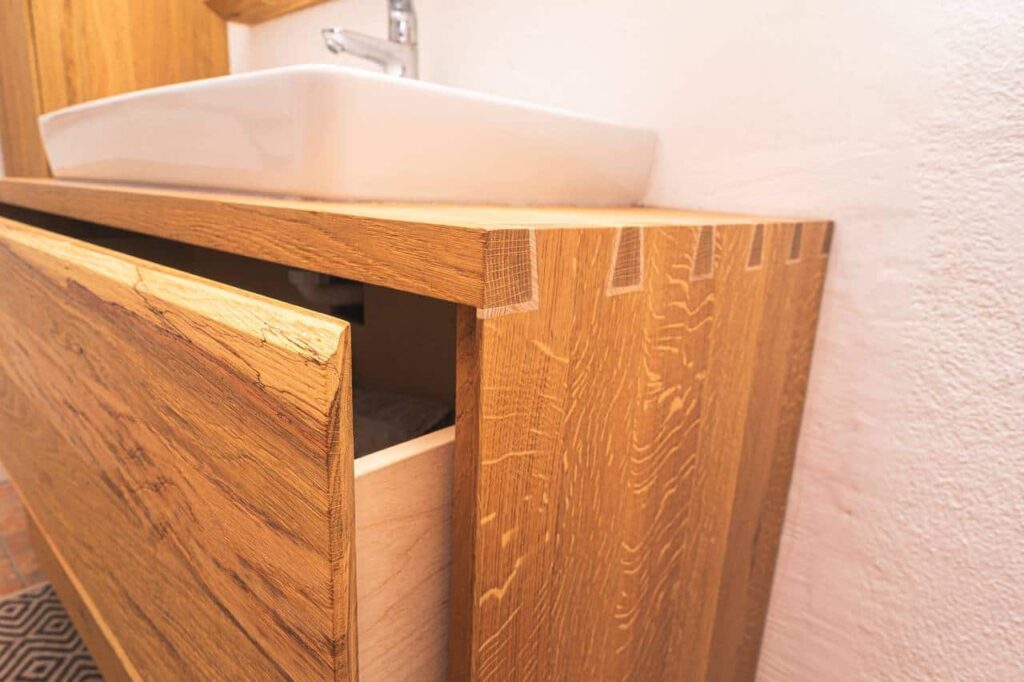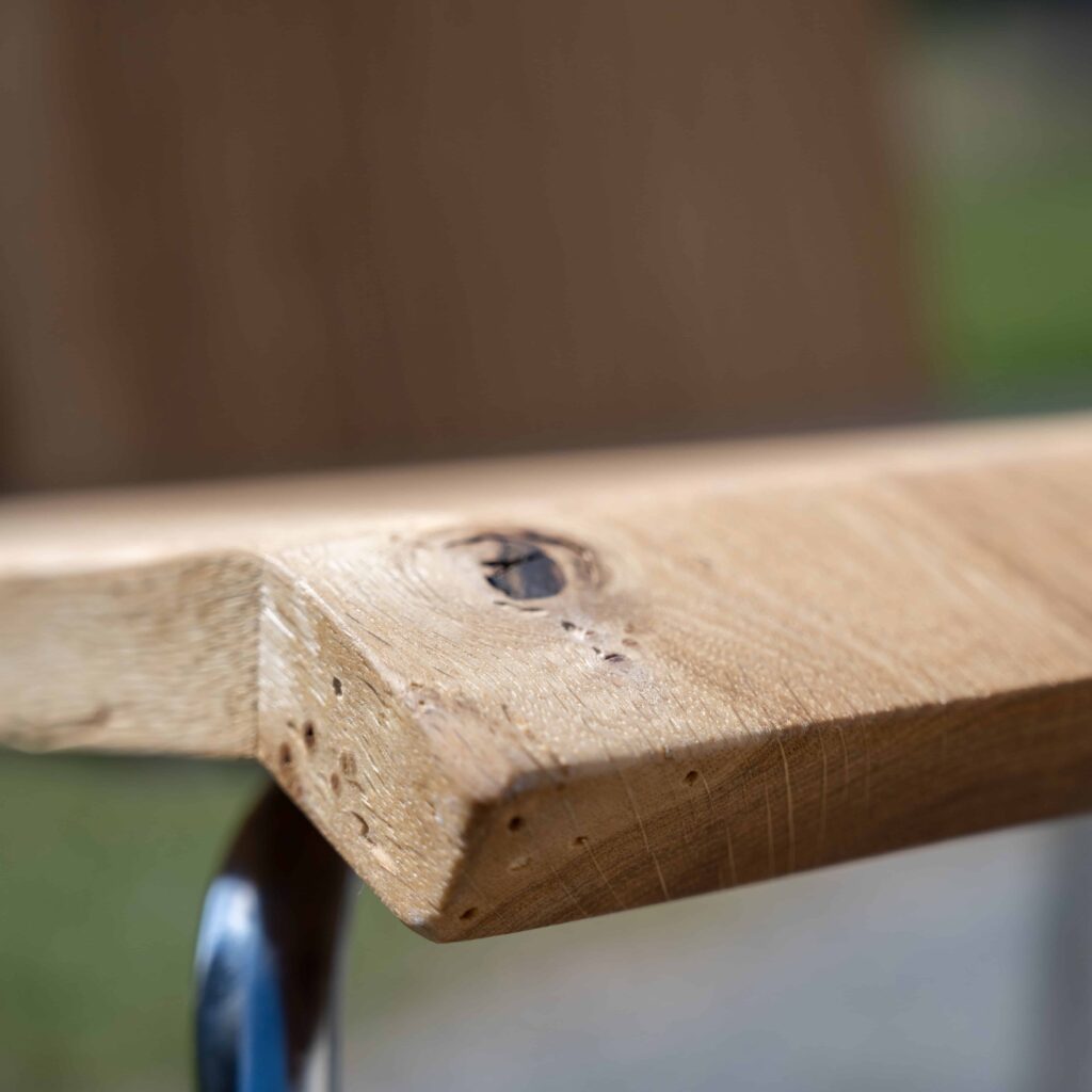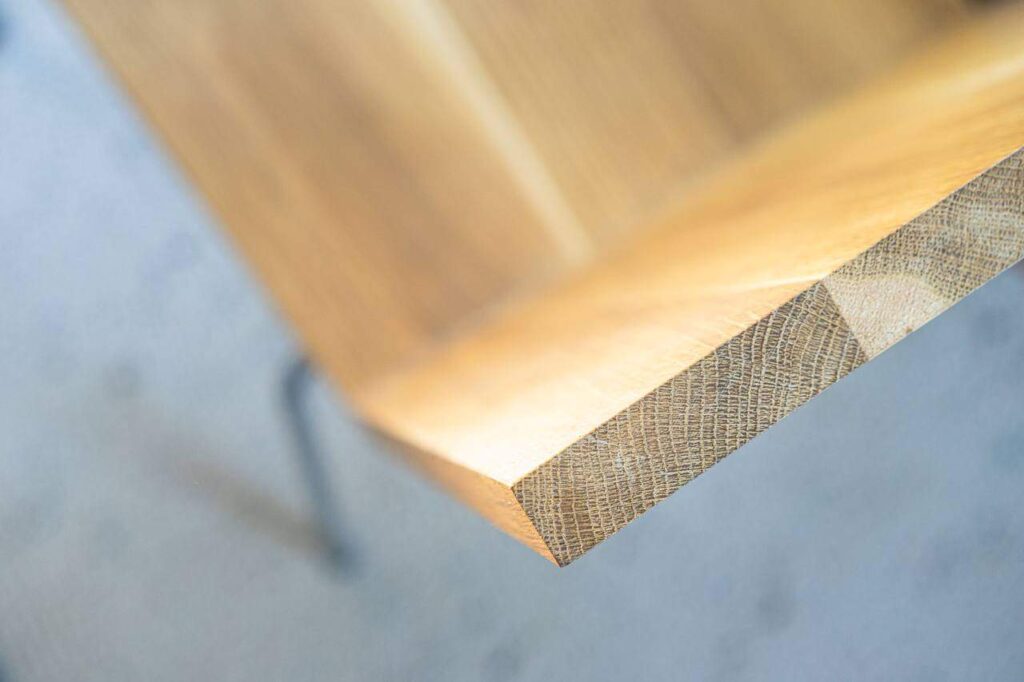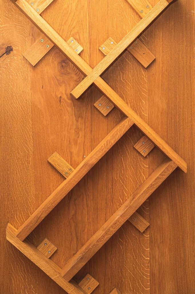 - Holzverbindung ohne Bindemittel: Die Verwendung von Druck anstelle von erdölbasierten Bindemitteln, um die zwei parallel verlaufenden Holzteile in der Breite zu verbinden, ist nicht nur eine handwerkliche Meisterleistung, sondern auch ein Ausdruck der Nachhaltigkeit in Kombination mit traditionellem Handwerk. Diese uralte Holzverbindungstechnik vermeidet nicht nur den Einsatz schädlicher Chemikalien, sondern betont auch die Wertschätzung für natürliche Materialien.
